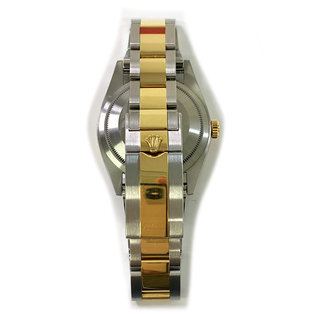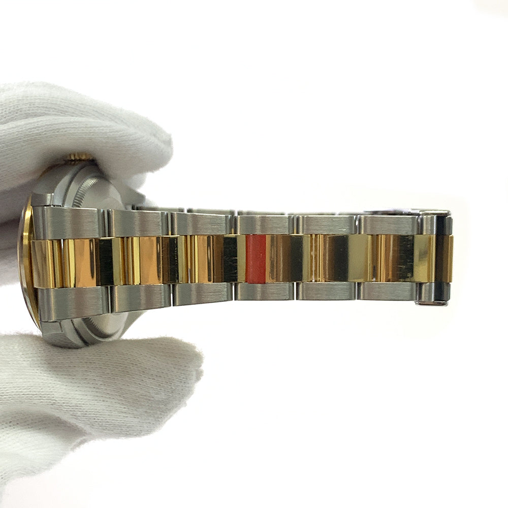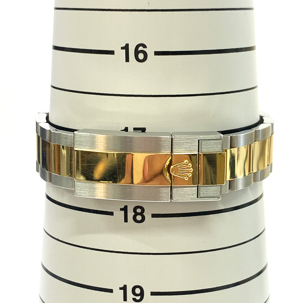 36mm yellow Rolesor case comprised of Oystersteel and 18K yellow gold, screw-down back, screw-down crown with twinlock double waterproofness system, 18K yellow gold smooth bezel, scratch-resistant sapphire crystal, black dial, index and Arabic hour markers filled with blue luminescent material, Rolex calibre 3230 automatic movement, approximately 70 hours of power reserve, yellow Rolesor Oyster bracelet with flat three-piece links, folding Oysterlock buckle with Easylink 5mm comfort extension link. Waterproof to 100 meters. SHORT 1 LINK.
