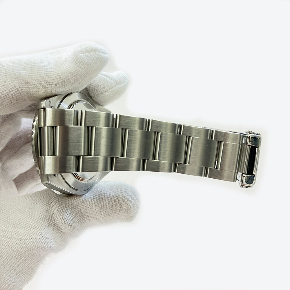 Silver-tone stainless steel case with a silver-tone stainless steel oyster bracelet. Bi-directional rotating black stainless steel bezel. Black dial with silver-tone hands and index hour markers. Minute markers around the outer rim. Dial Type: Analog. Luminescent hands and markers. Date display at the 3 o'clock position. Rolex Calibre 3175 Automatic movement, containing 31 Jewels, bitting at 28800 vph, and has a power reserve of approximately 48 hours. Scratch resistant sapphire crystal. Screw down crown. Solid case back. Round case shape, case size: 40 mm. Fold over clasp. Water resistant at 100 meters / 330 feet. Functions: date, GMT, second time zone, hour, minute, second. Gmt Master Series. OPEN PAPER.