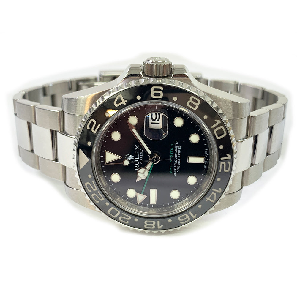 Rolex Calibre 3186 Automatic movement, containing 31 Jewels, bitting at 28800 vph, and has a power reserve of approximately 50 hours. Scratch resistant sapphire crystal. Screw down crown. Solid case back. Round case shape, case size: 40 mm, case thickness: 12 mm. Band width: 19.5 mm, band length: 7 1/4 inches. Folding oyster lock clasp. Water resistant at 100 meters / 330 feet. Functions: GMT, second time zone, date, hour, minute, second, chronometer. HAVE GREEN SERIAL TAG.