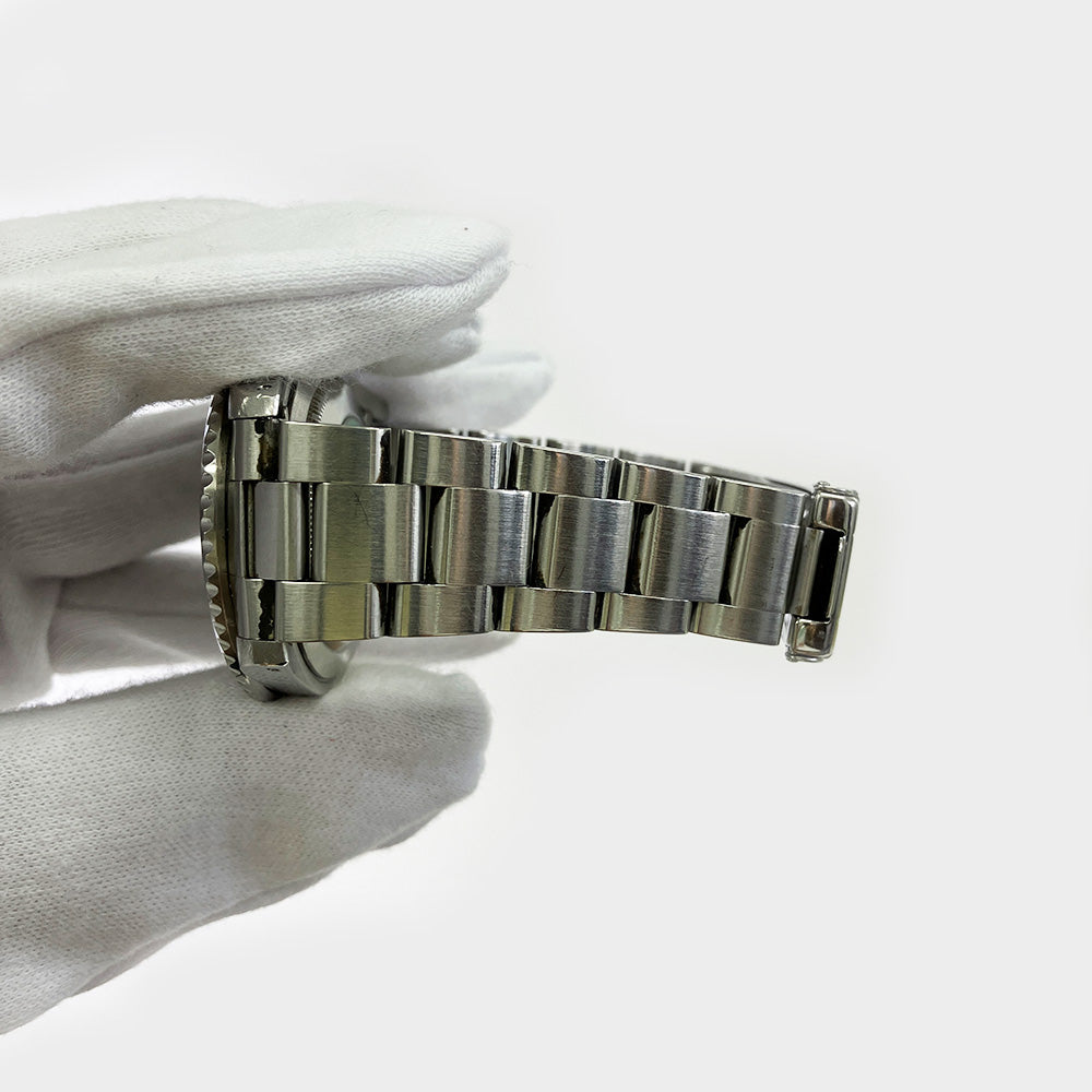 Silver-tone stainless steel case with a silver-tone stainless steel oyster bracelet. Bi-directional rotating black stainless steel bezel. Black dial with silver-tone hands and index hour markers. Minute markers around the outer rim. Dial Type: Analog. Luminescent hands and markers. Date display at the 3 o'clock position.