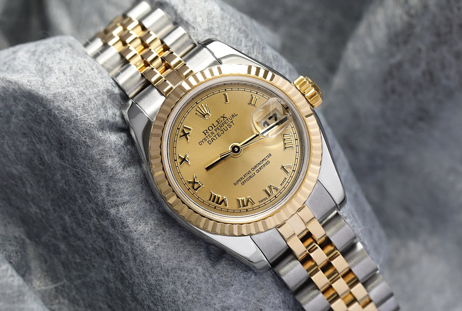 Rolex Lady-Datejust 179173 26mm Steel & Yellow Gold Watch Champagne Roman Dial Jubilee