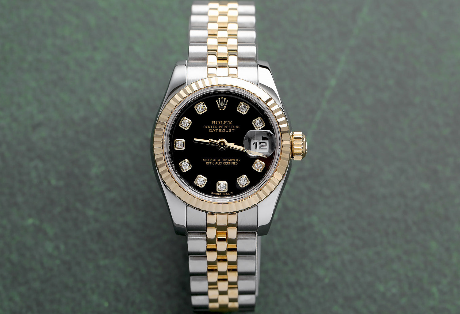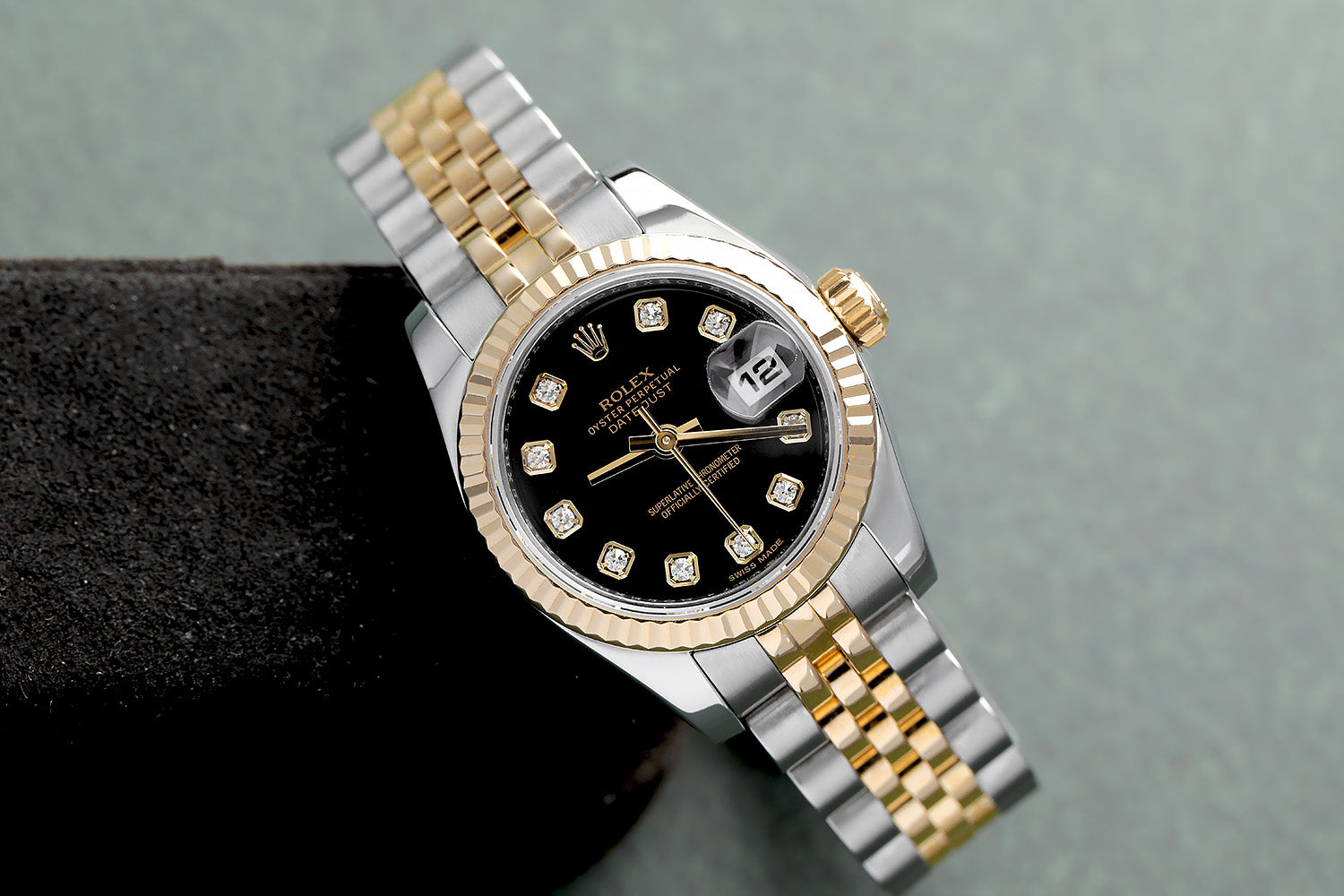 Rolex Lady-Datejust 179173 26mm Steel & Yellow Gold Watch Factory Black Diamond Dial Jubilee Band