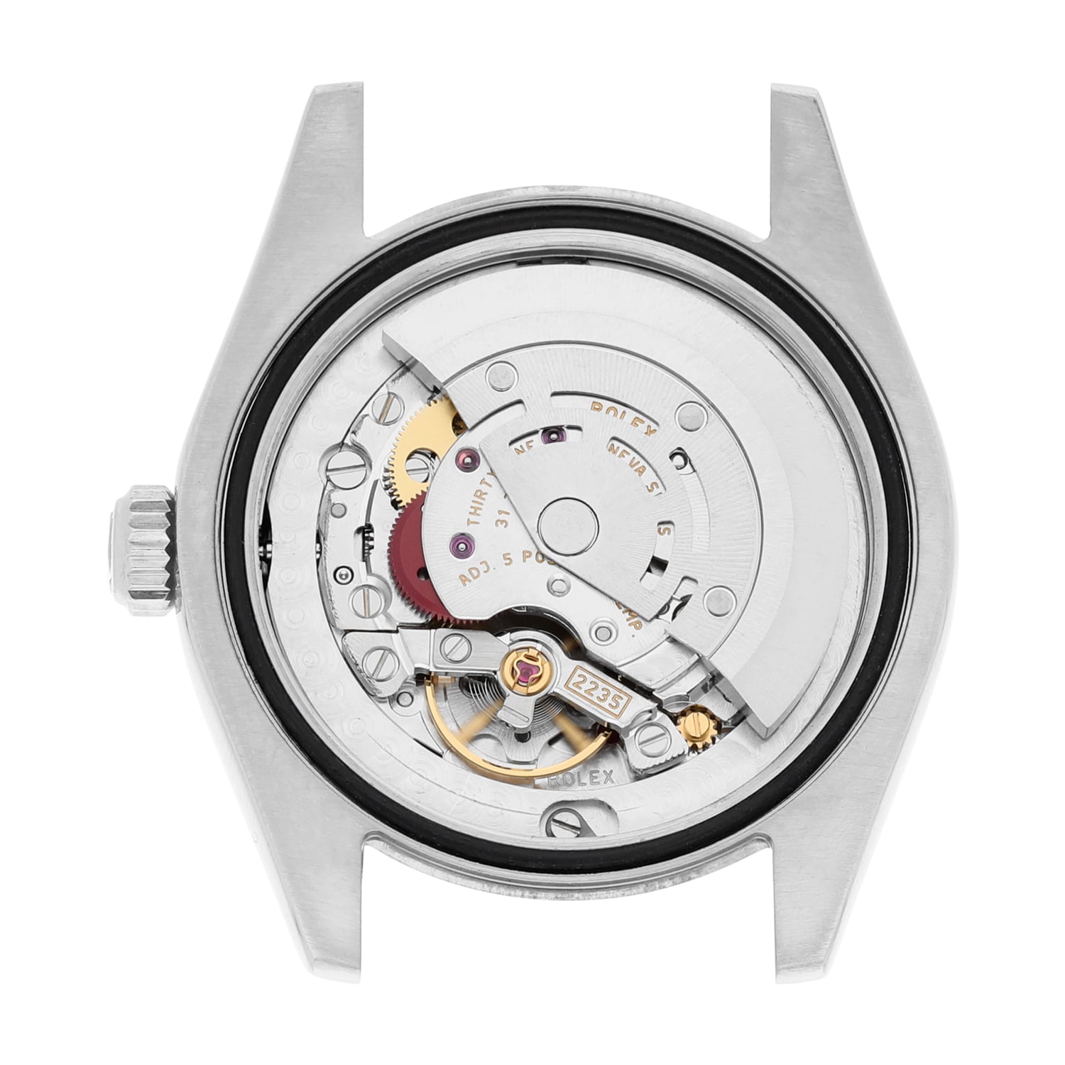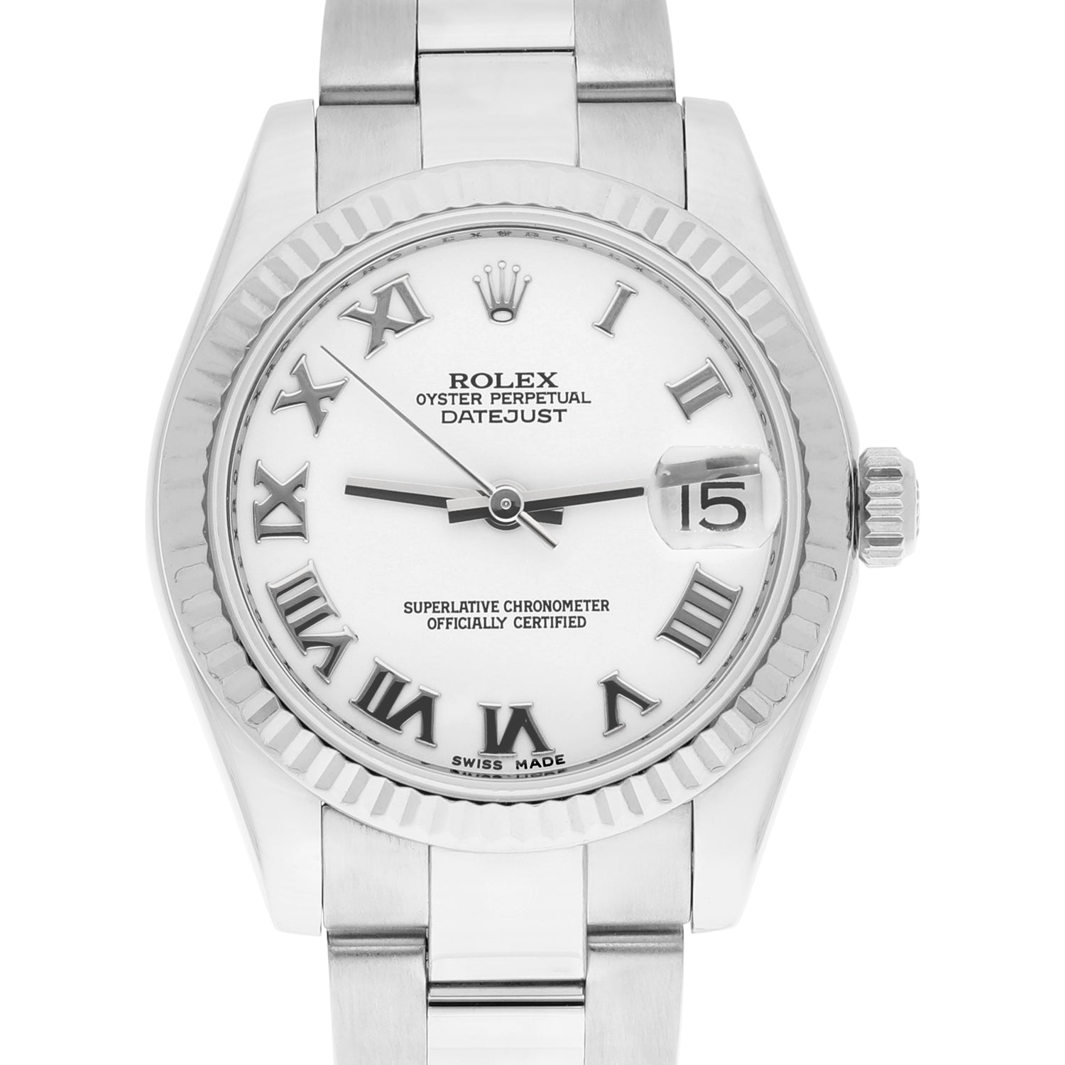 Mother of pearl dial with silver-tone hands and Roman numeral hour markers. Dial Type: Analog. Date display at the 3 o'clock position. Rolex Calibre 2235 Automatic movement, containing 31 Jewels, bitting at 28800 vph, and has a power reserve of approximately 48 hours. Scratch resistant sapphire crystal. Screw down crown. Solid case back. Round case shape, case size: 31 mm. Fold over clasp with a safety release. Water resistant at 100 meters / 330 feet. Functions: day, hour, minute, second. Datejust Series. Luxury watch style.