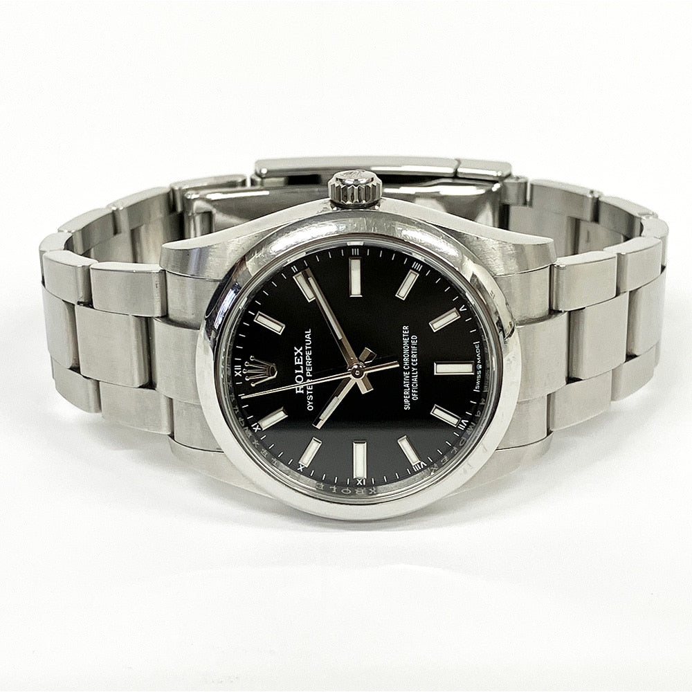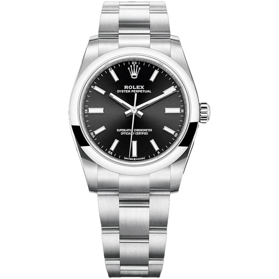 The Rolex Oyster Perpetual 124200 34mm Oystersteel case, screw-down crown with twinlock double waterproofness system, domed bezel, scratch-resistant sapphire crystal. Bright black dial, index hour markers, Rolex calibre 2232 automatic movement with center hour, minute and seconds hands, and stop-seconds for precise time setting, approximately 55 hours of power reserve.