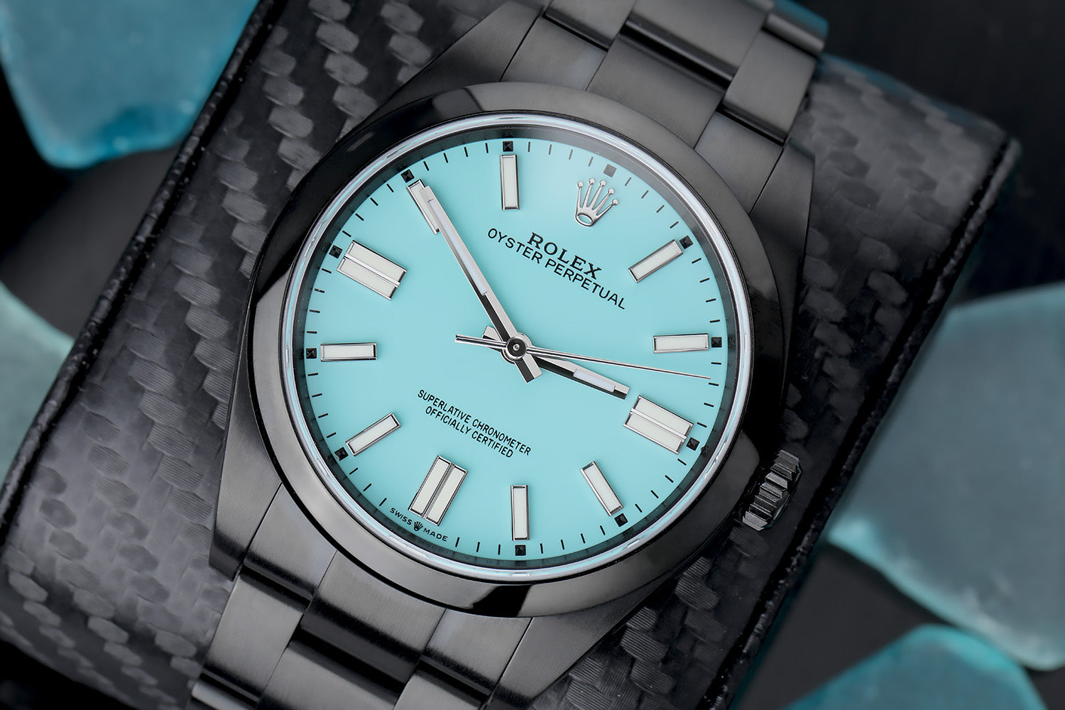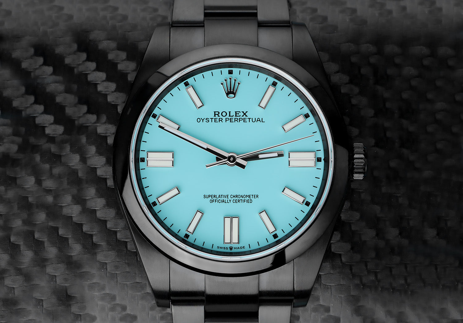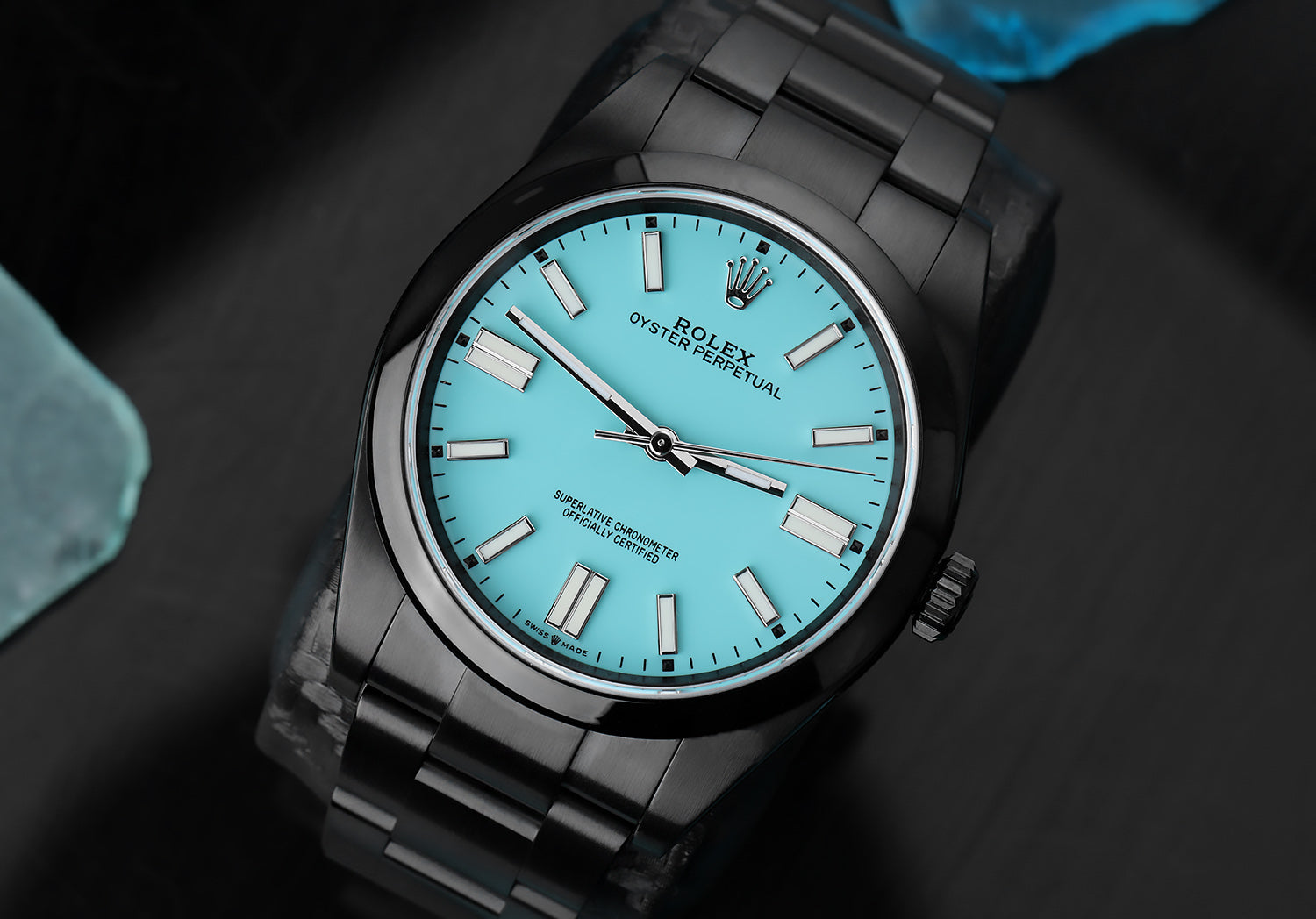 This custom Rolex Oyster Perpetual 114300 presents a 39mm stainless steel case with a black PVD/DLC coating. Blue dial is complemented by silver-tone hands and index hour markers. Driven by the automatic Caliber 3132 movement, it offers a 48-hour power reserve.