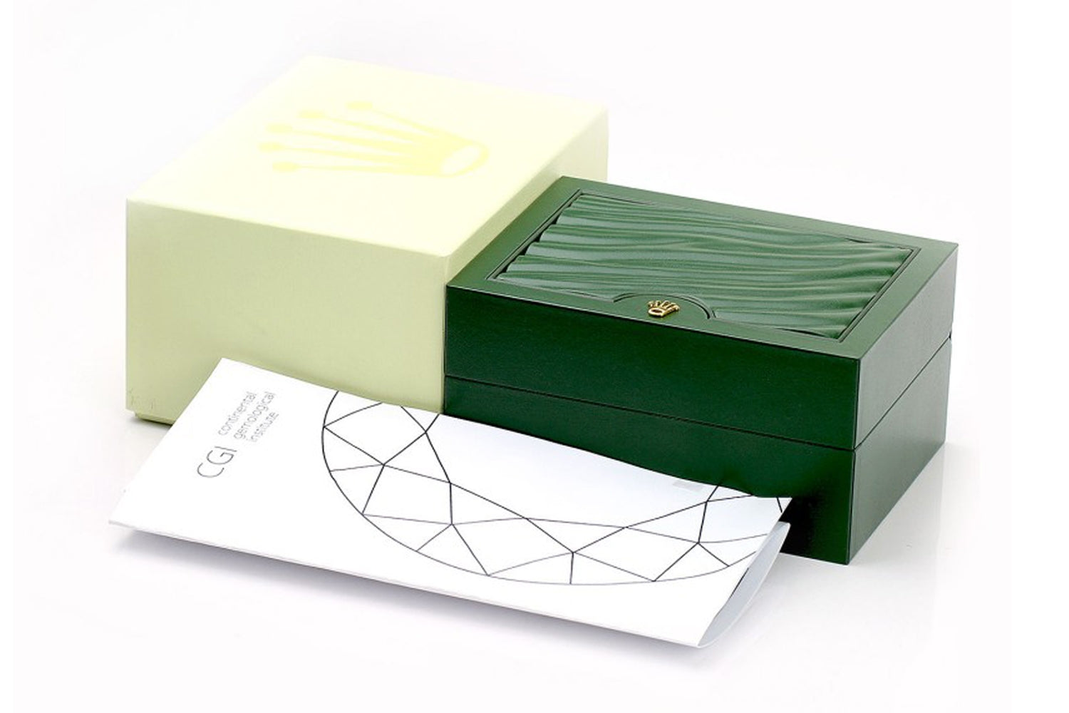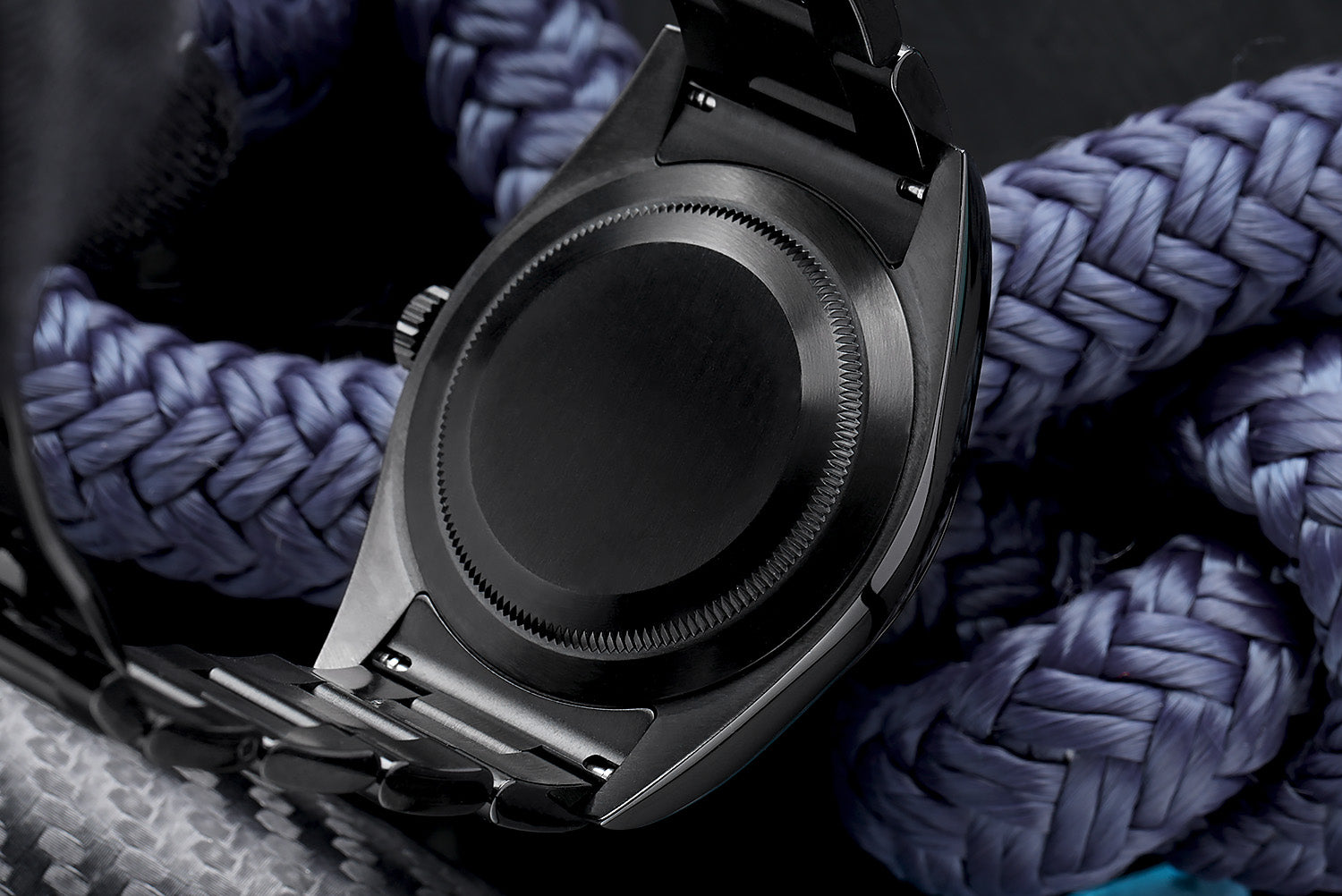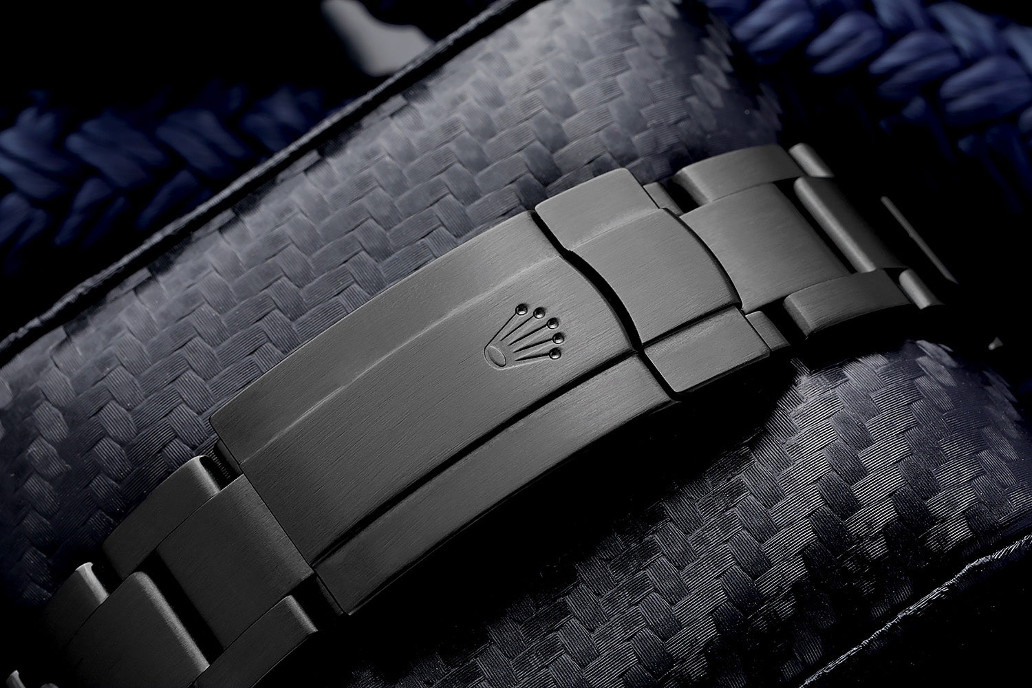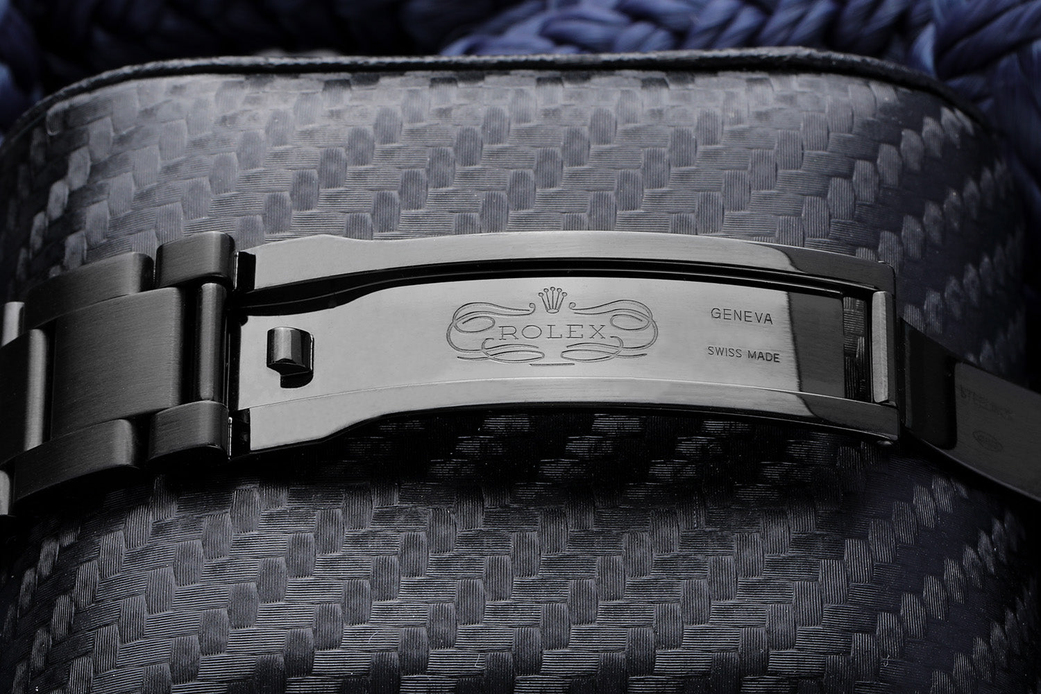 The watch features a scratch-resistant sapphire crystal, screw-down crown, and is water-resistant up to 100 meters. Paired with a black PVD/DLC coated Oyster bracelet.