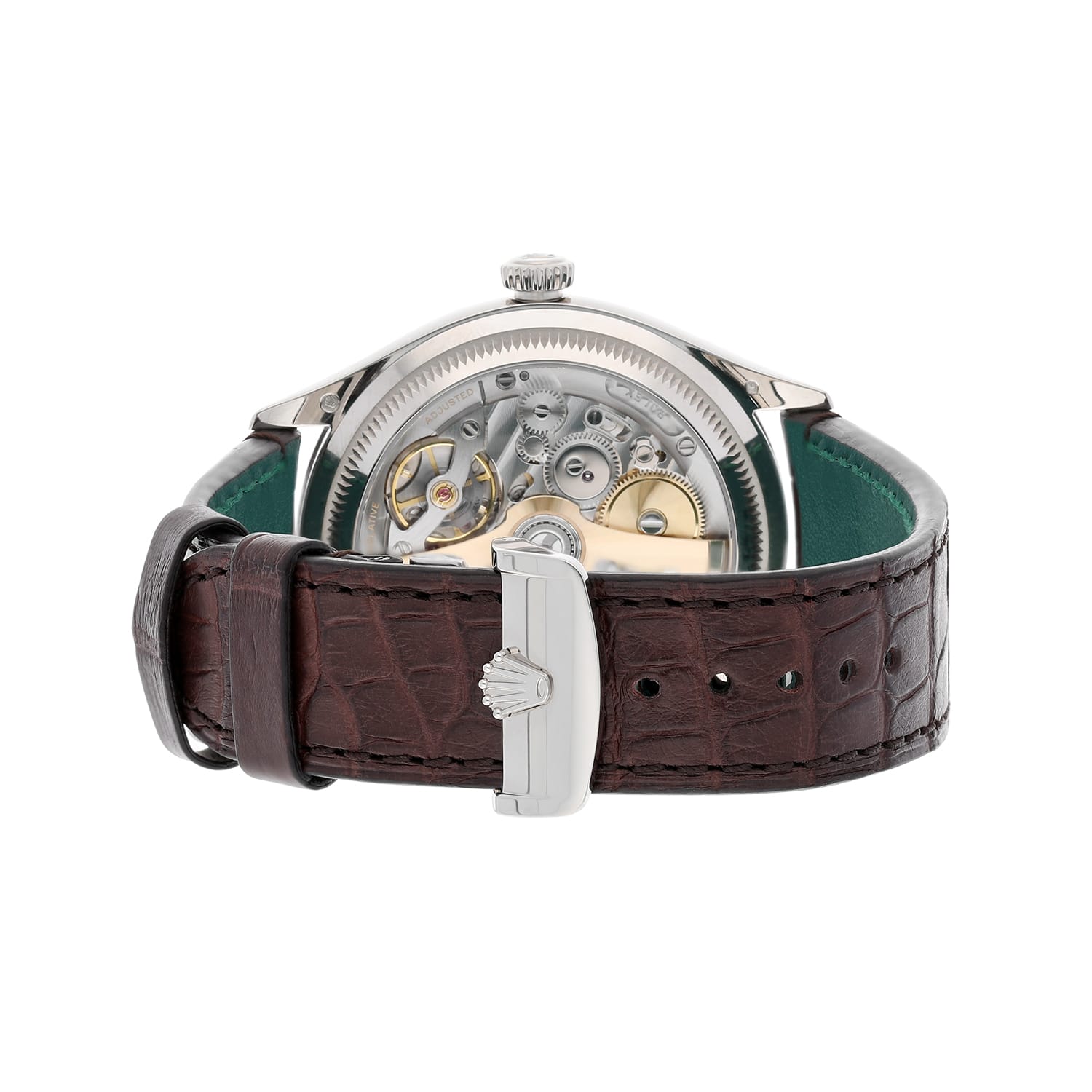 With a white lacquer dial , slim profile, and display caseback (a rarity for Rolex), this model merges heritage with modern craftsmanship. The Calibre 7140 movement offers exceptional precision and a 66-hour power reserve. Every detail speaks of exclusivity, from the leaf-style hands to the fluted bezel on a glossy black alligator strap.