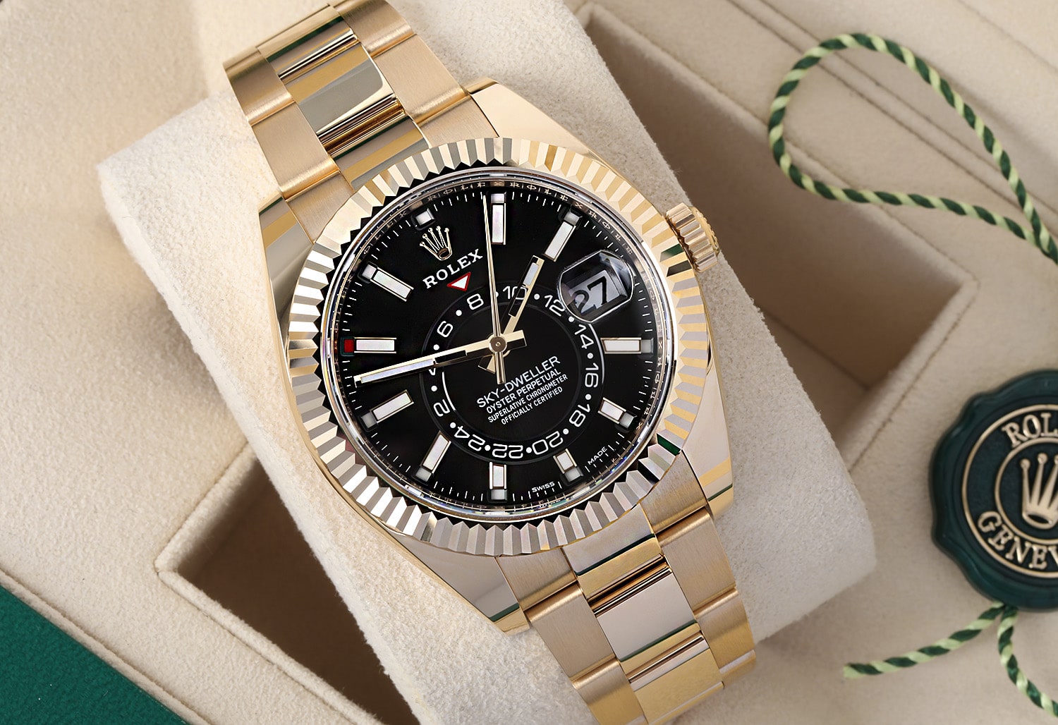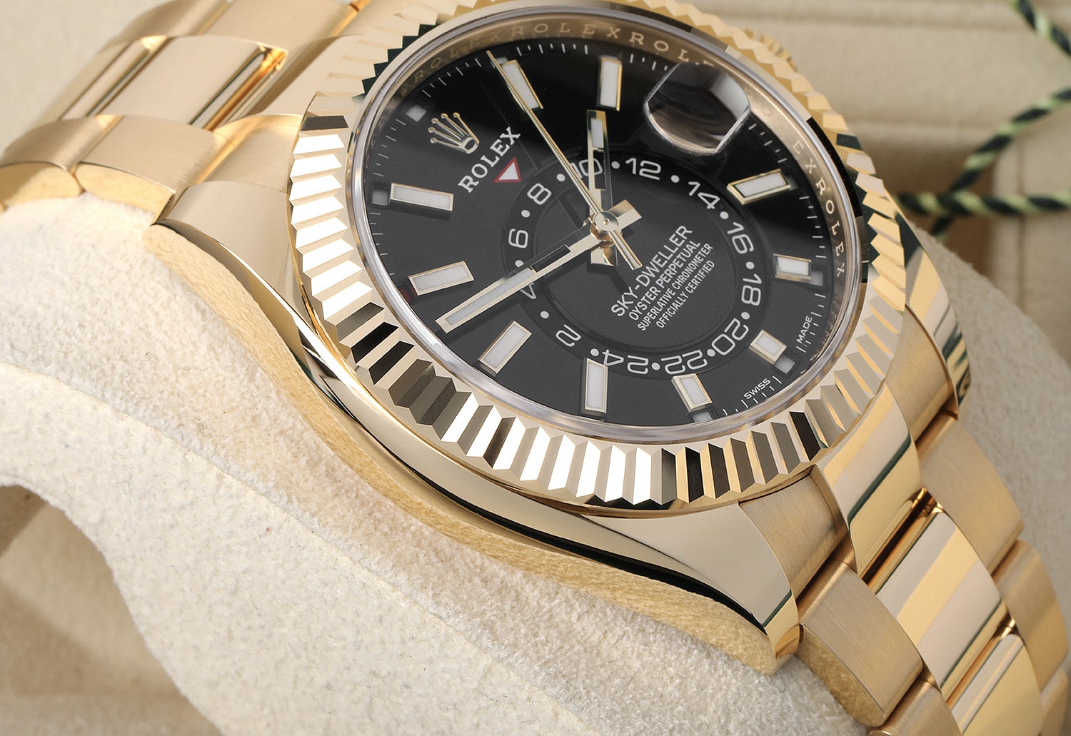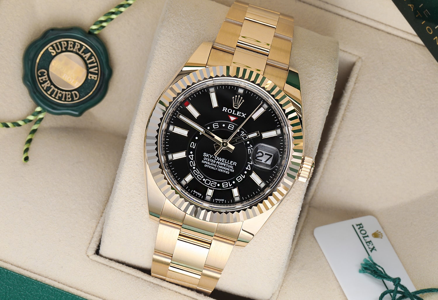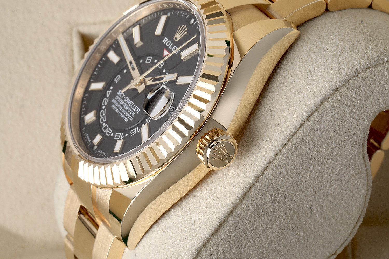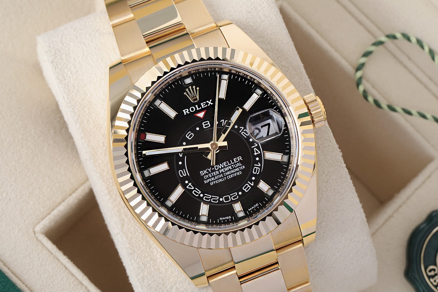 Rolex Sky-Dweller 42mm Oyster 326938 Yellow Gold Watch Black Index Dial Never Worn