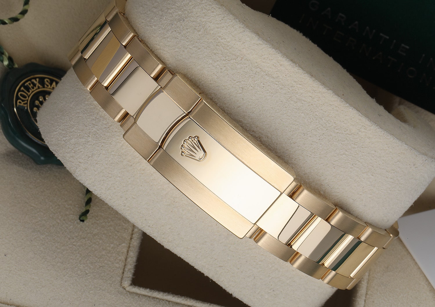 18kt yellow gold case with a 18kt yellow gold rolex oyster bracelet. Fluted ring command 18kt yellow gold bezel. Black dial with luminous yellow gold-tone hands and index hour markers. Minute markers around the outer rim. Dial Type: Analog. Date display at the 3 o'clock position. One subdial displaying: 24 hour.