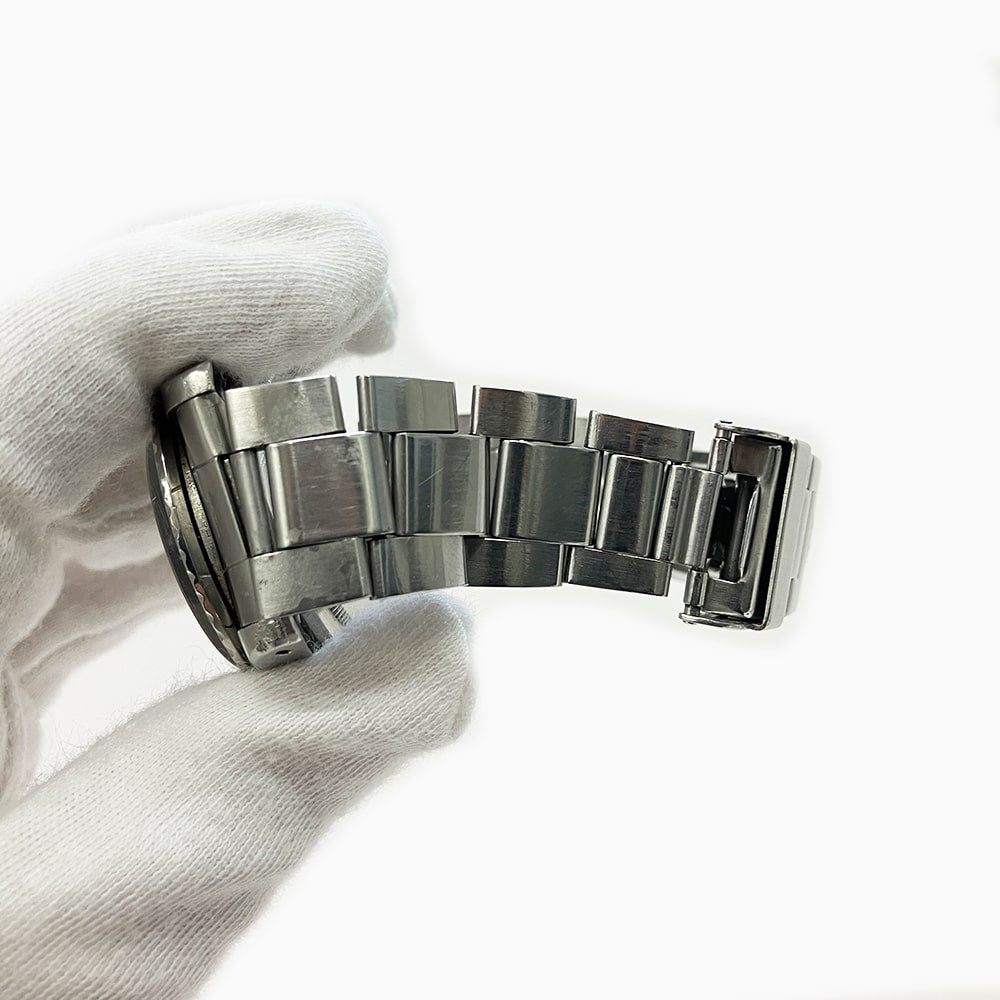 Silver-tone stainless steel case with a silver-tone stainless steel oyster bracelet. Black stainless steel bezel. Black dial with silver-tone hands and index hour markers. Minute markers around the outer rim. Dial Type: Analog. Luminescent hands and markers. Date display at the 3 o'clock position. Automatic movement. Scratch resistant acrylic crystal. Screw down crown.