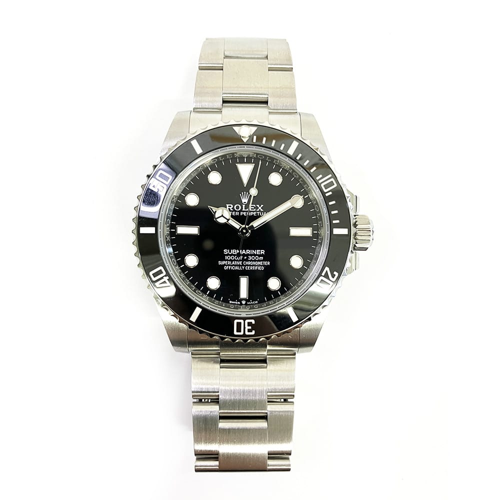 The Rolex Submariner Reference 124060 41mm stainless steel case. Black dial with luminescent hands and markers. Stainless steel bracelet with stainless steel folded clasp. The watch is powered by the automatic Caliber 3230, offering a 70-hour power reserve. It also boasts impressive water resistance of up to 30 ATM (300 meters). Luxury watch style. Watch label: Swiss Made.