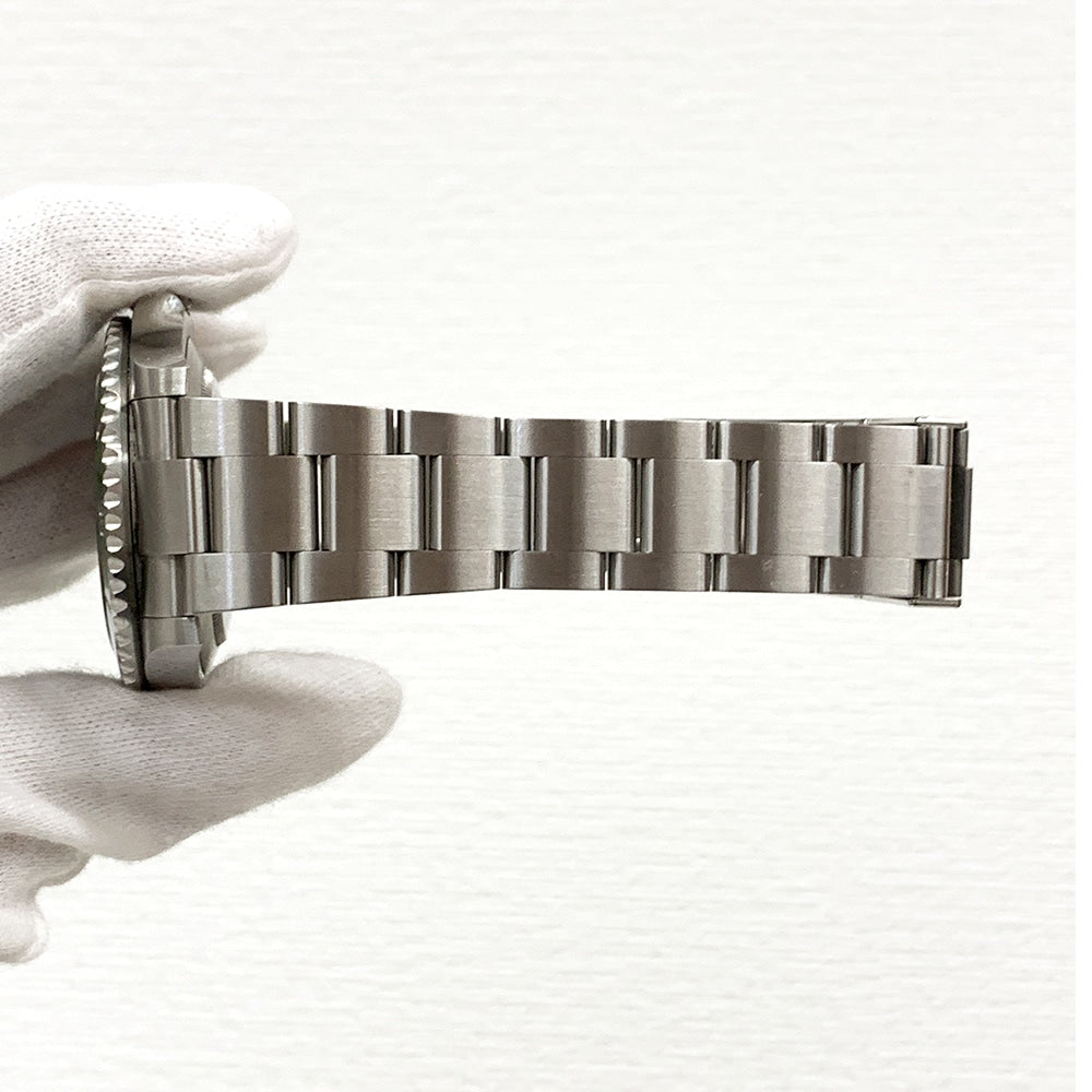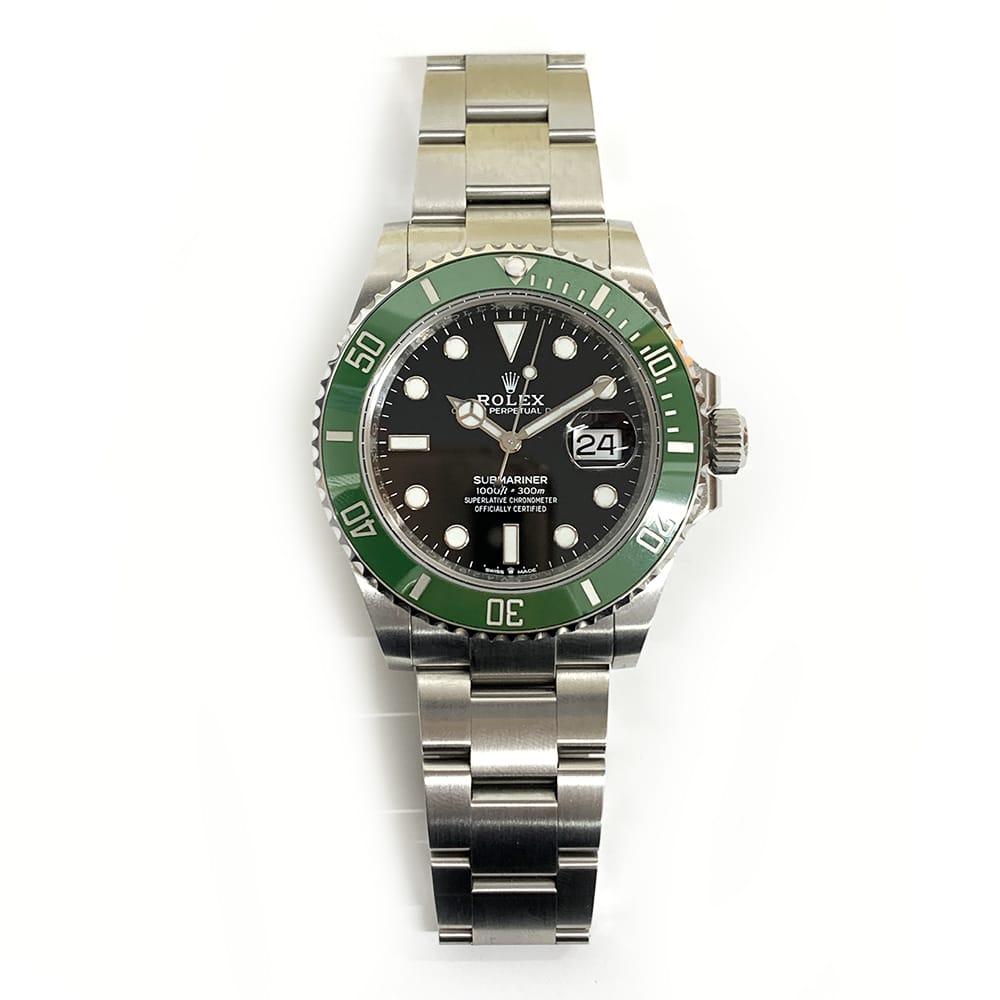 41 mm Oystersteel case, screw-down crown with triplock triple waterproofness system, unidirectional rotatable bezel with green Cerachrom insert and platinum coated numerals and graduations, scratch-resistant sapphire crystal with cyclops lens over the date, black dial.