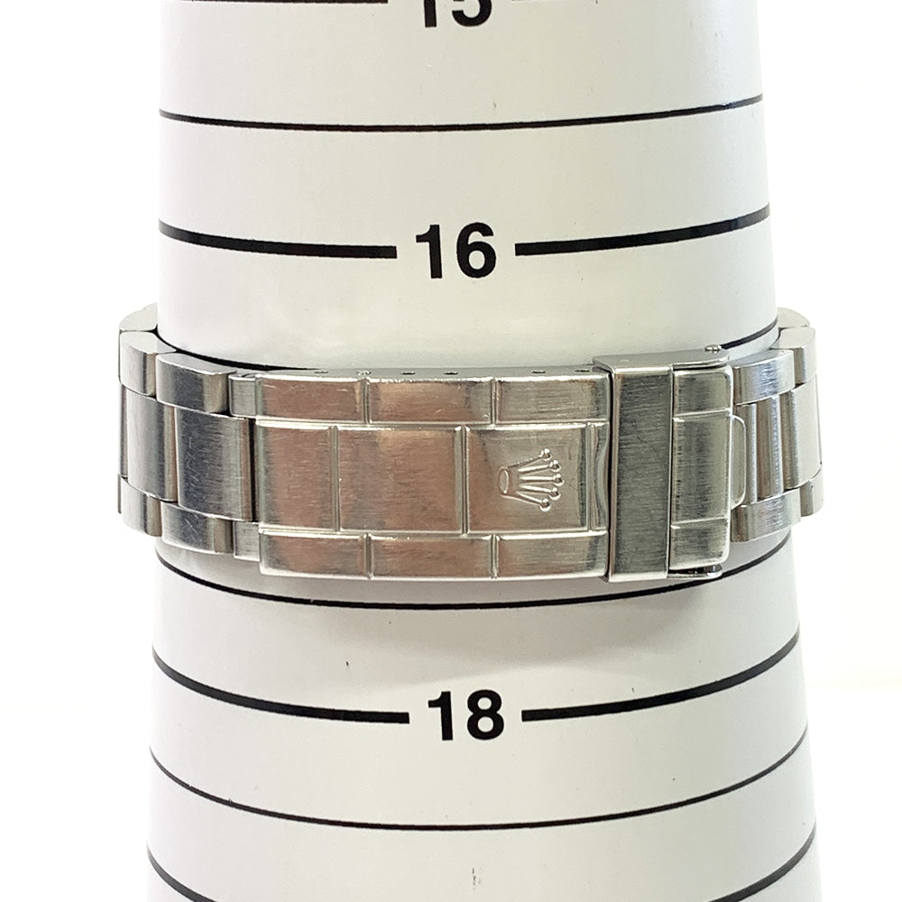 Silver-tone stainless steel case with a silver-tone stainless steel oyster bracelet. Black stainless steel bezel. Black dial with silver-tone hands and index hour markers. Minute markers around the outer rim. Dial Type: Analog. Luminescent hands and markers.