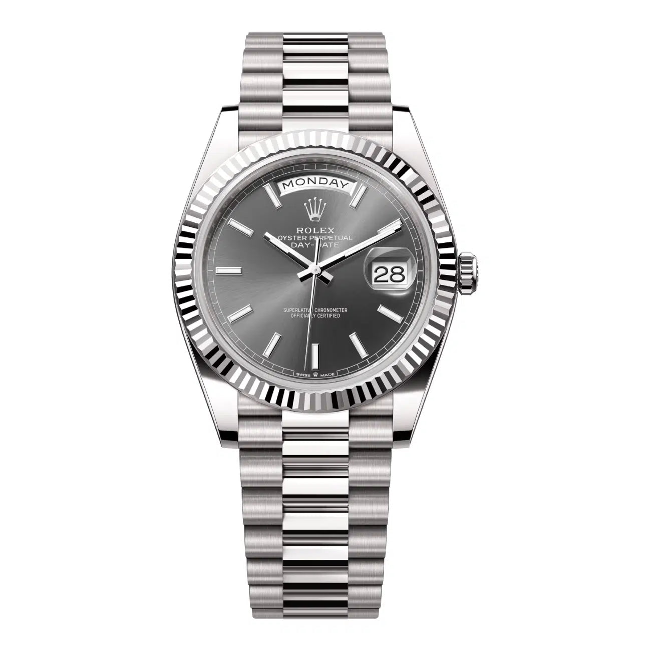 Rolex White Gold Day-Date 40 President Bracelet Fluted Bezel 228239-0060 Index Dial Watch 2024