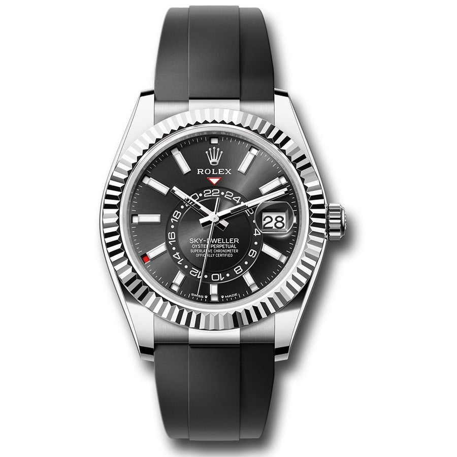 Rolex White Gold Sky-Dweller 336239-0002 Fluted Bezel Black Index Dial Oysterflex Strap 2024