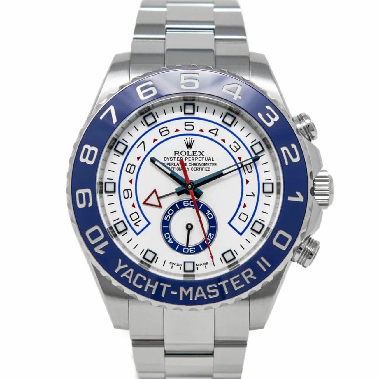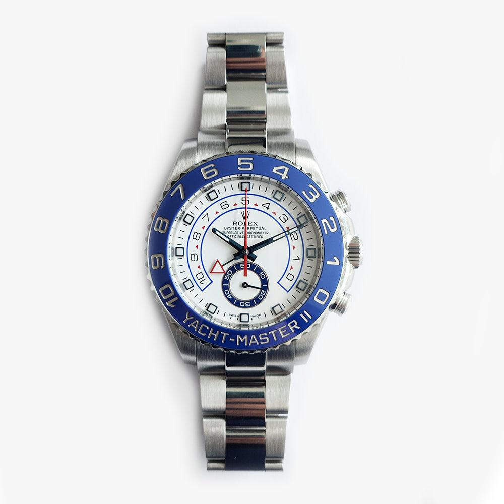 The Rolex Yacht-Master II, Model # 116680, Stainless steel 44mm case, with Stainless steel Rolex oyster bracelet. Bi-directional rotating silver-tone bezel with a blue cerachrom insert. White dial with luminous blue hands and square hour markers. Minute markers around the outer rim. Luminescent hands and markers. Small seconds sub-dial above the 6 o'clock position.