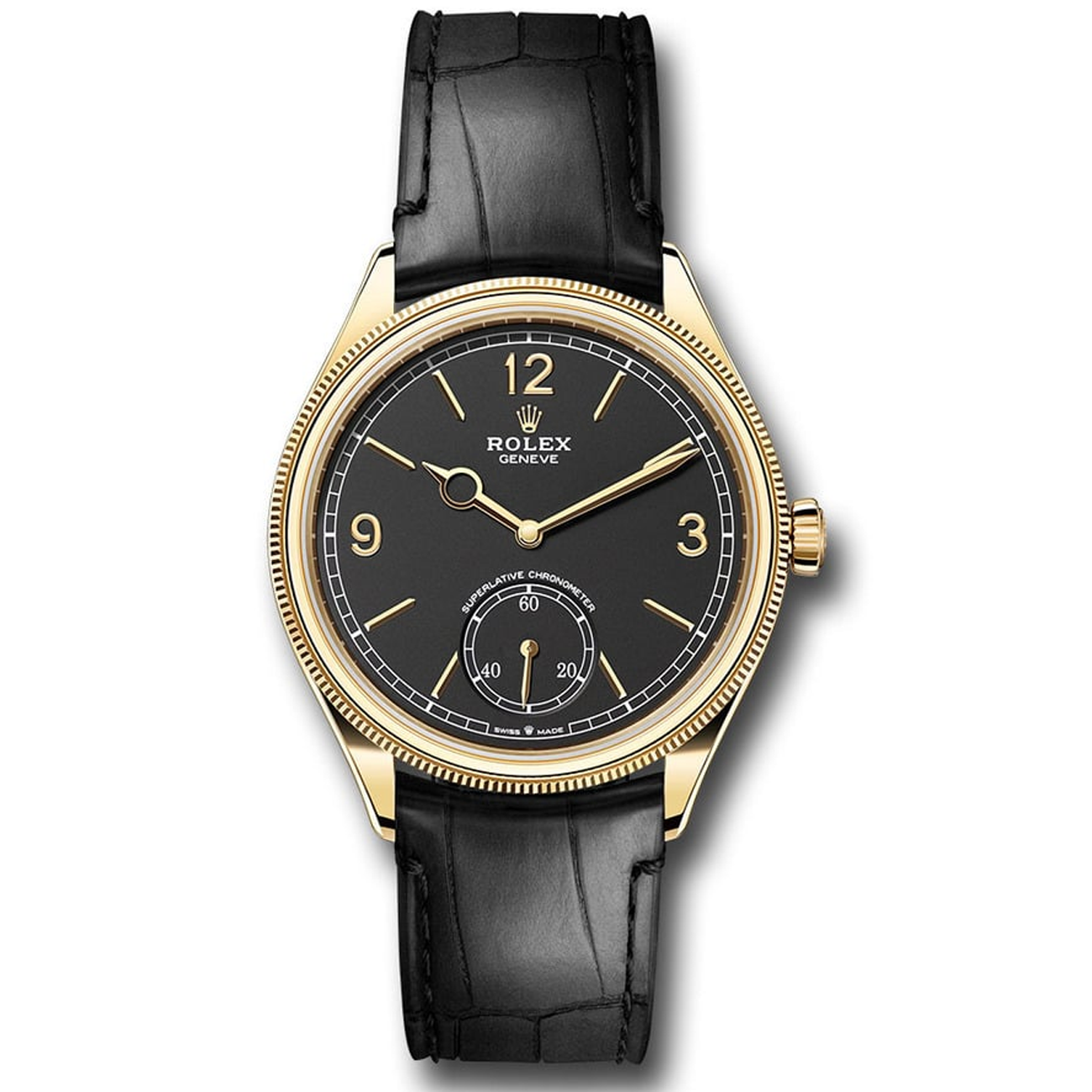 Rolex Yellow Gold 1908 Watch 52508-0002 Fluted Bezel Black Index Arabic Dial Alligator Leather Strap 2024